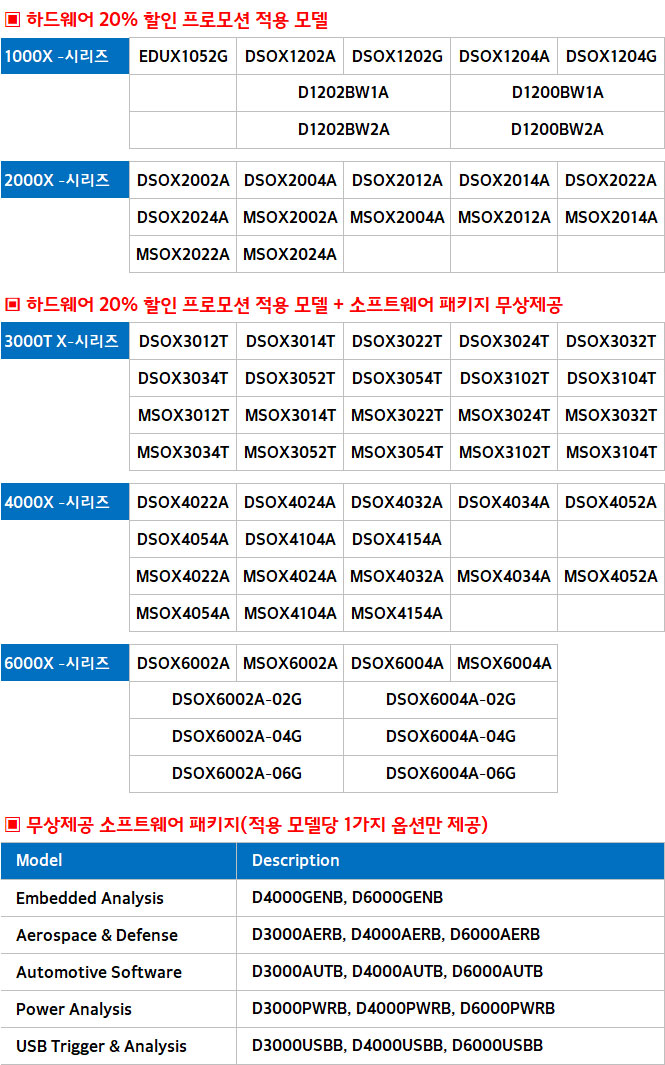 프로모션 기간내에 키사이트 InfiniiVision 오실로스코프를 20% 할인된 가격에 구입할수 있으며, InfiniiVision 3000T/4000/6000 X-시리즈 오실로스코프를 구입하면 무료 오실로스코프 소프트웨어 패키지를 무상으로 제공하여 최대 40%의 비용을 절감할수 있습니다.